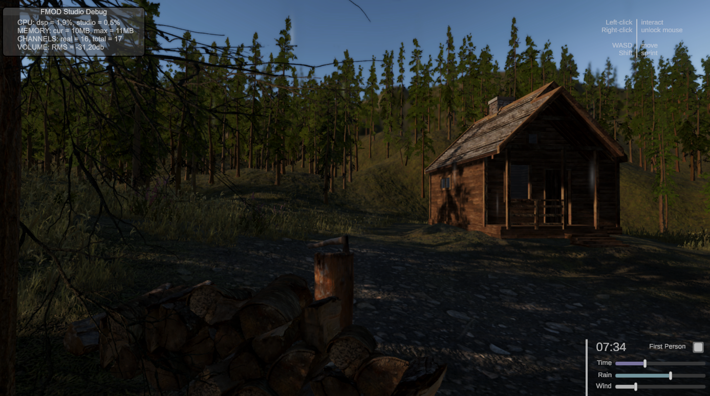An interactive first-person scene developed for the course “Sound in Interaction,” designed to maximize player immersion within a mountain shelter environment. The prototype simulates a tranquil forest setting where the audio reacts dynamically to player actions and in-game parameters. Key interactive sound effects include: variable footsteps on different surfaces, opening/closing a door, radio music inside the hut and chopping wood (minigame). The ambient soundscape adapts to a real-time day-night cycle and changing weather conditions (wind & rain), creating a calm, slow-paced, and deeply atmospheric experience.